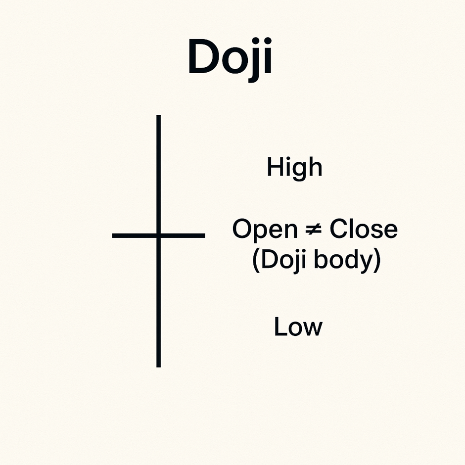A Doji candlestick is a special pattern where the opening and closing prices are almost equal, resulting in a candle with little to no body but visible upper and lower wicks (shadows).