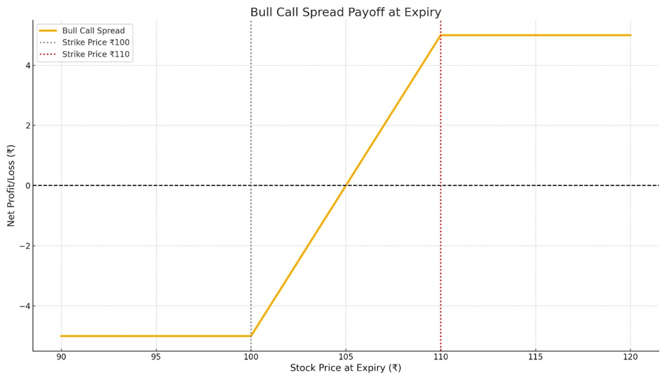 Max profit = ₹10 (spread) – ₹5 (premium) = ₹5